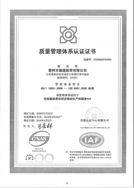 泰州市康建膠帶有限公司經(jīng)過十多年的發(fā)展已經(jīng)成為一家從事輸送帶和傳動帶類及相關(guān)設(shè)備生產(chǎn)和銷售的公司。位于中國經(jīng)濟發(fā)達的長三角經(jīng)濟圈江蘇省泰州市高港區(qū),交通發(fā)達。我司以“合格的產(chǎn)品,滿意的服務(wù)”為宗旨,發(fā)揚團結(jié)、開拓、拼搏爭先的創(chuàng)業(yè)精神,“康建”在全國行業(yè)樹立了良好的企業(yè)形象。“康建”產(chǎn)品已通過ISO9001國際質(zhì)量體系認(rèn)證,從原料﹑工藝等方面進行了嚴(yán)格的控制,從而確保了產(chǎn)品質(zhì)量的穩(wěn)定可靠,成為各......